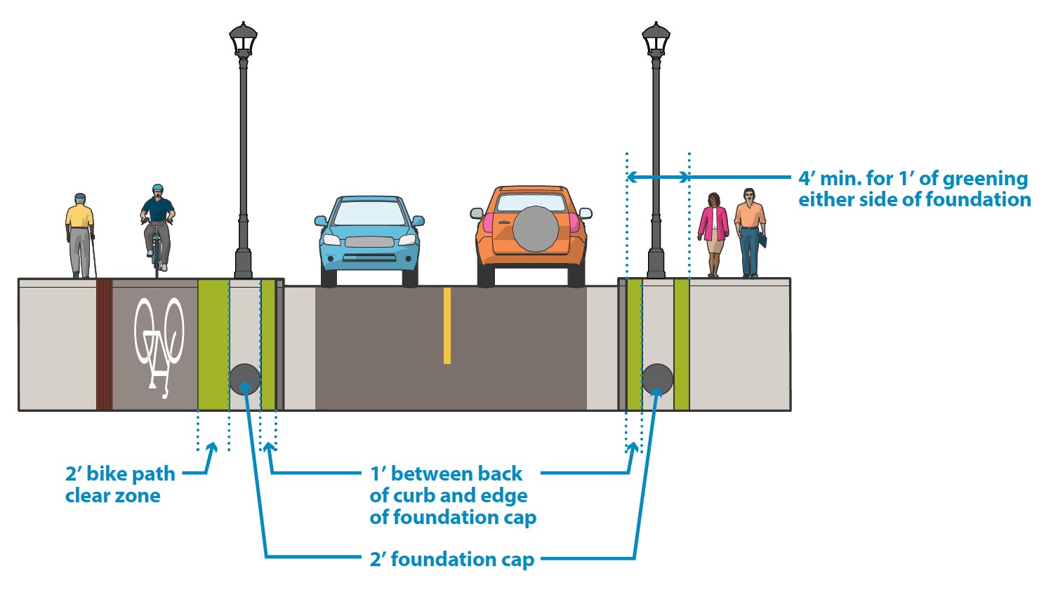 When adjacent to a bikeway, there should generally be a minimum clearance of 2’ between the streetlight foundation and the bikeway. In constrained environments or stop conditions, designers can consider narrower clearance. |