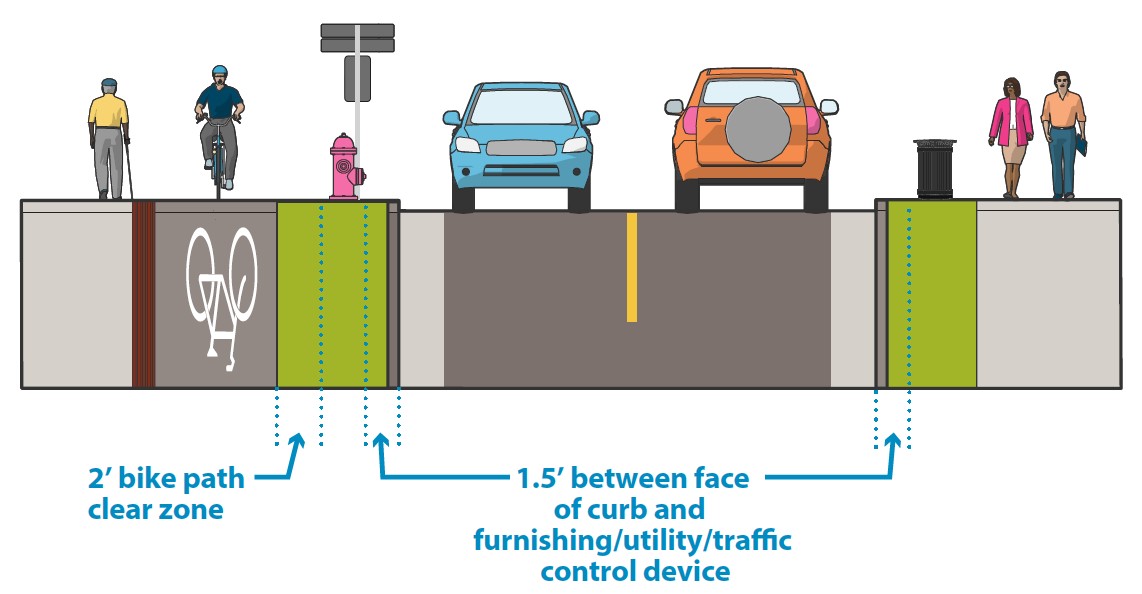 1.5’ clearance is generally required from the face of curb to utilities and signs, including for fire hydrants, service cabinets, APS pushbutton poles, utility poles, waste receptacles, parking meter pay stations, signs, and bicycle racks. 1’ clearance is used between the face of curb and the edge of the foundation for streetlights. Traffic signals are typically centered 2’ off the face of curb, which means the clearance is a minimum of 1’ to the edge of the foundation. |