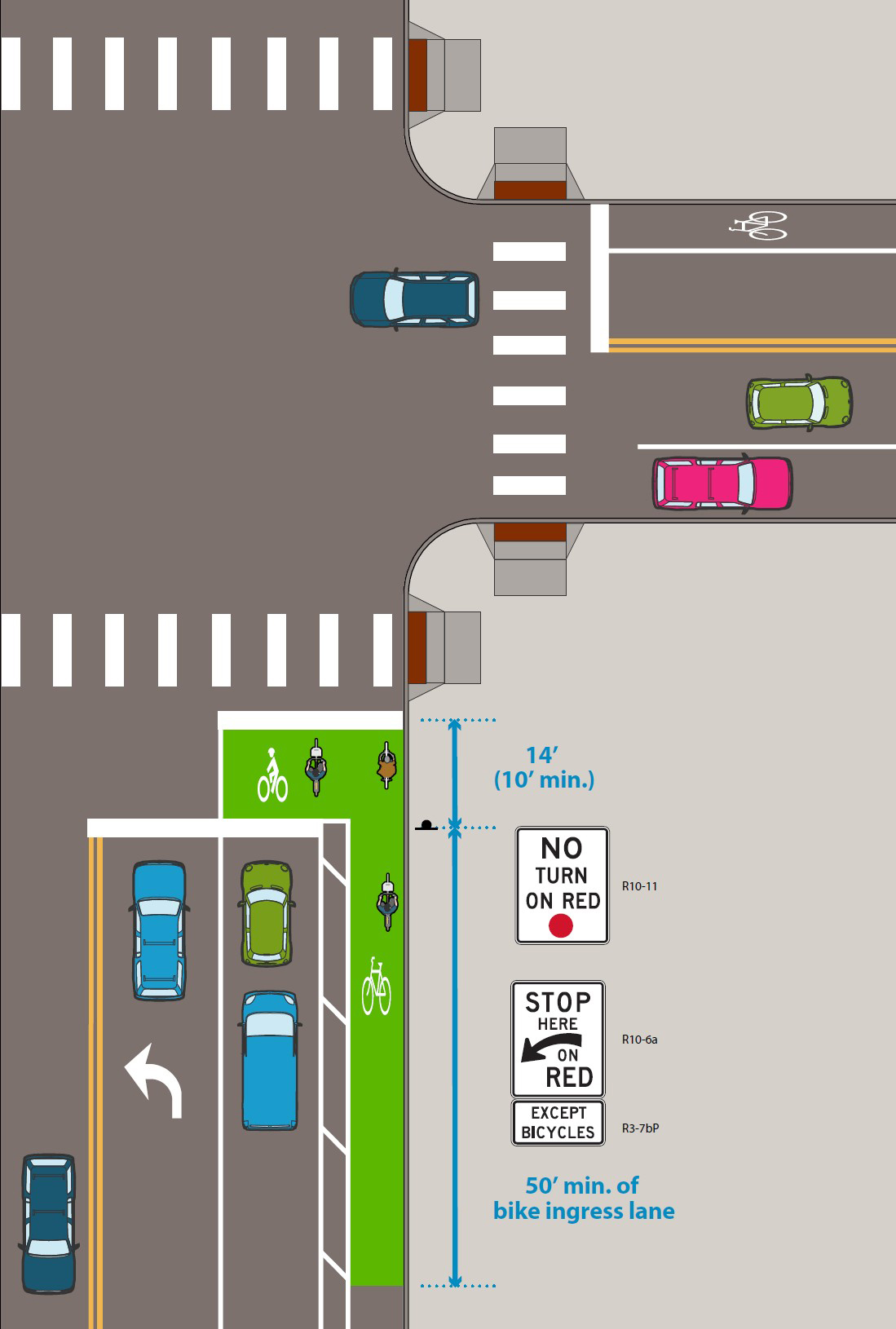 “NO TURN ON RED” (R10-11) or “STOP HERE ON RED” (R10-6a) restrictions with and “EXCEPT BICYCLES” plaque (R3-7bP) should be used to prevent vehicles from entering the queuing area. |