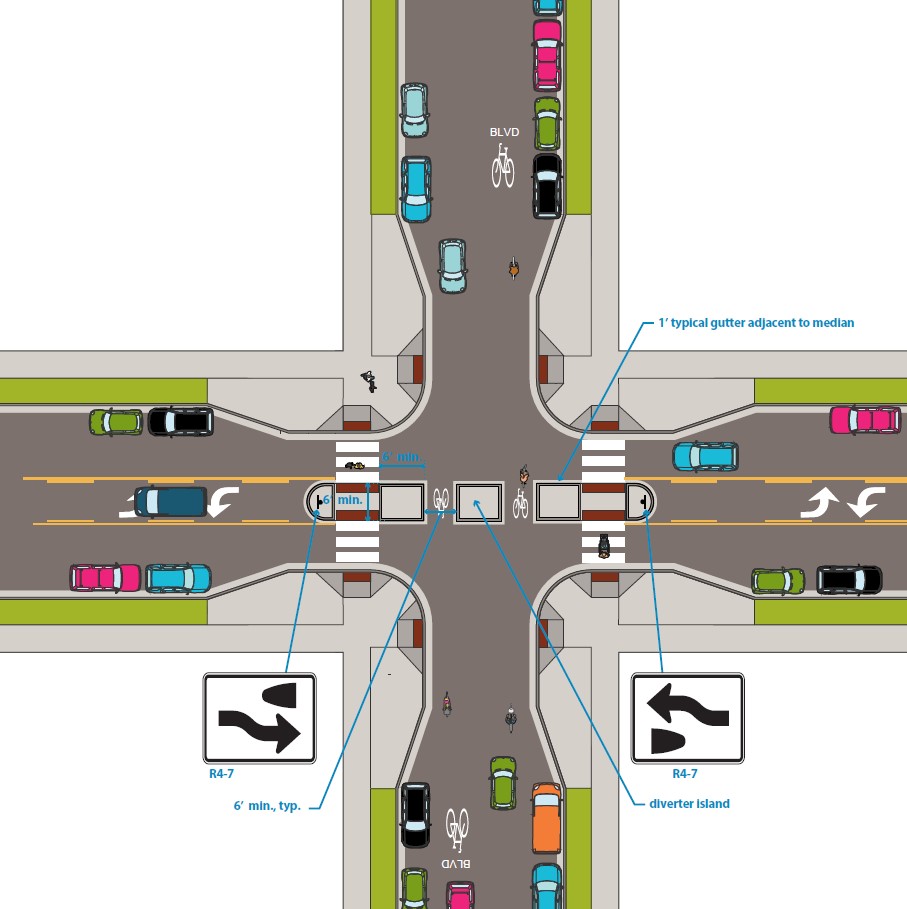 Safety islands can be implemented with a diverter to restrict traffic along neighborhood greenways or eliminate vehicle crossing at unsignalized intersections with high crash rates. Coordinate with the Fire Department if considering a diverter. See Figure 3.7D.5. |