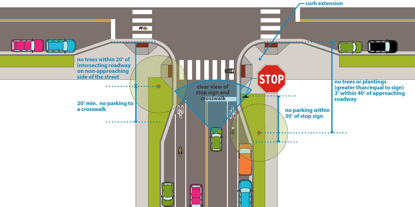 Street trees should not be located within 40’ of an approaching cross street and within 20’ of a non-approaching cross street (see Figure 3.7D.1). |