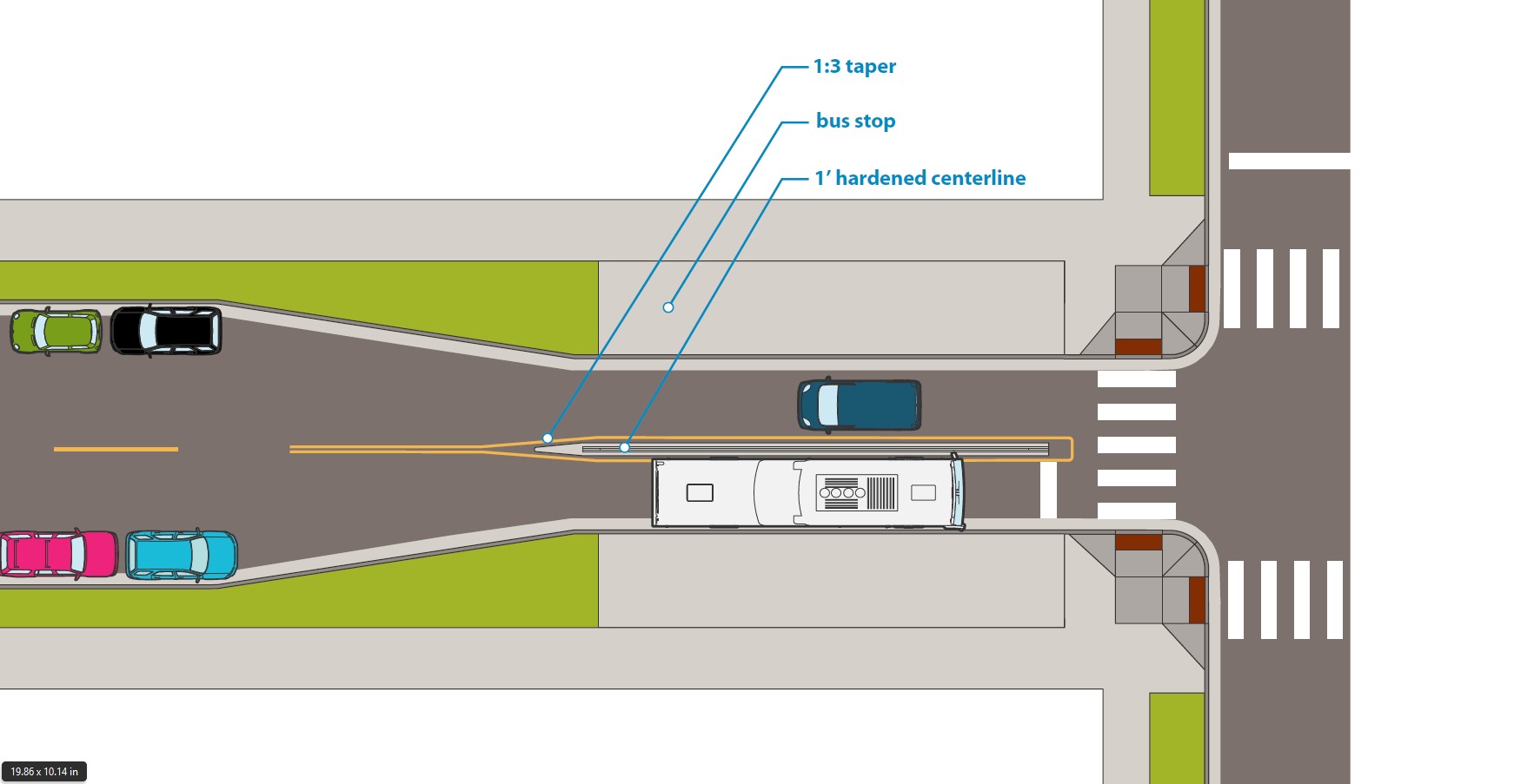 A hardened centerline or a median should be considered at an in-lane bus stop when a bus will be stopping in the sole traffic lane in a given direction. The hardened centerline or median is provided to reduce the likelihood that drivers will pass the bus.