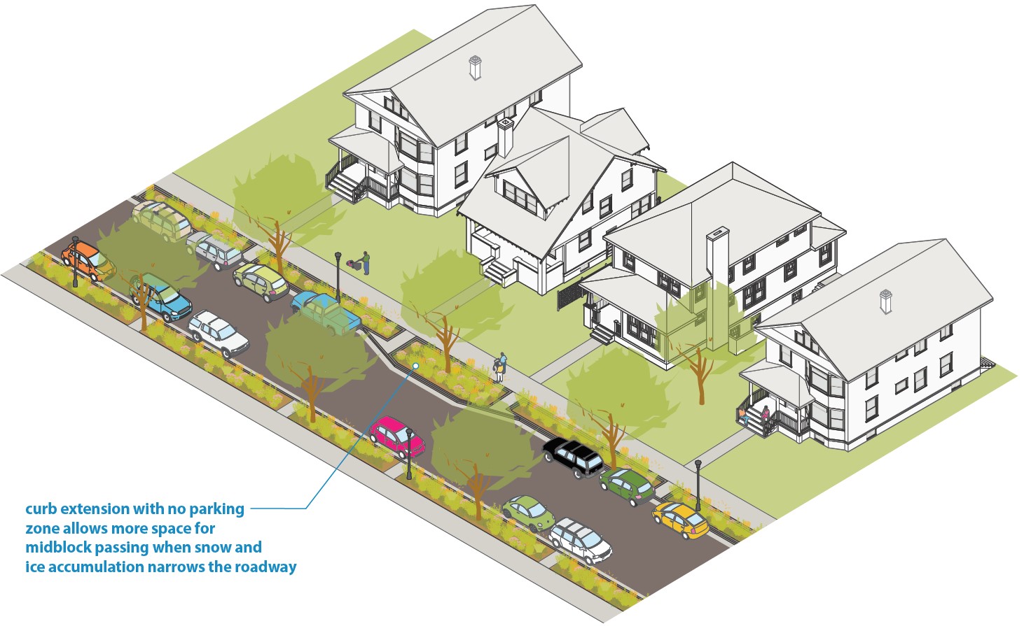 The preferred way to support winter access is to provide one or more midblock passing points where a curb extension replaces parking on one side (see Figure 3.6B.3). Such a zone provides space for a vehicle to pull over and allow another car to pass when snow and ice buildup has narrowed the driving area.