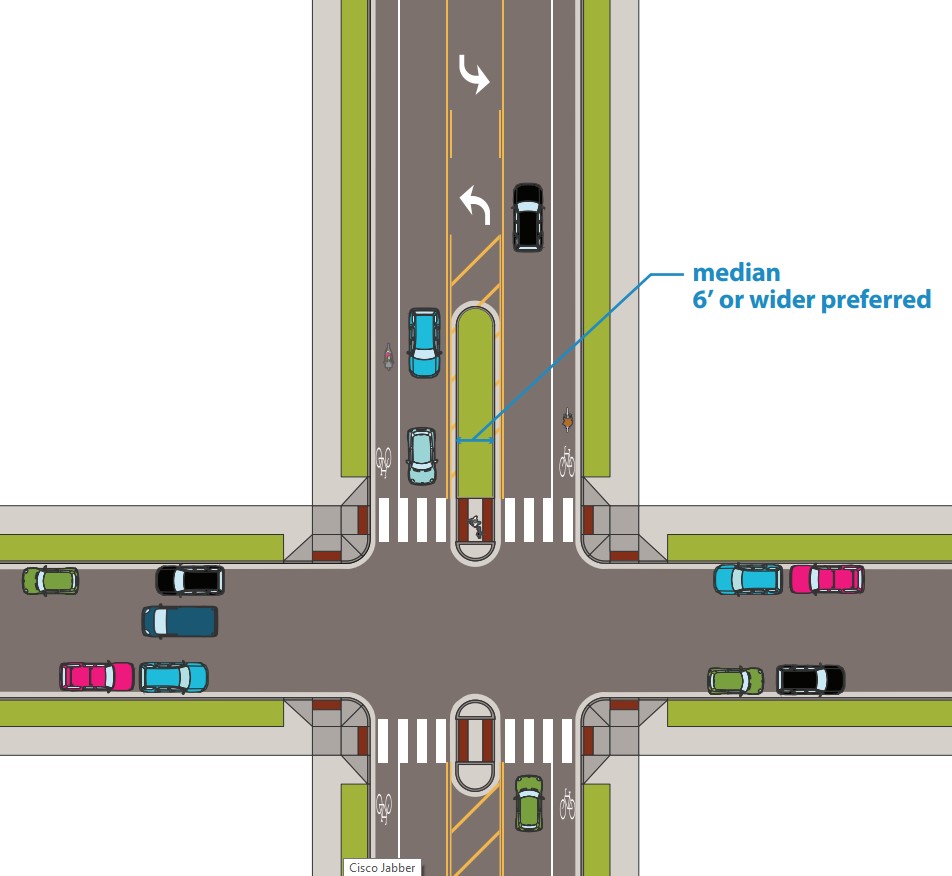 - Medians of 6’ and wider are preferred because they provide an accessible pedestrian refuge space and additional space for greening.