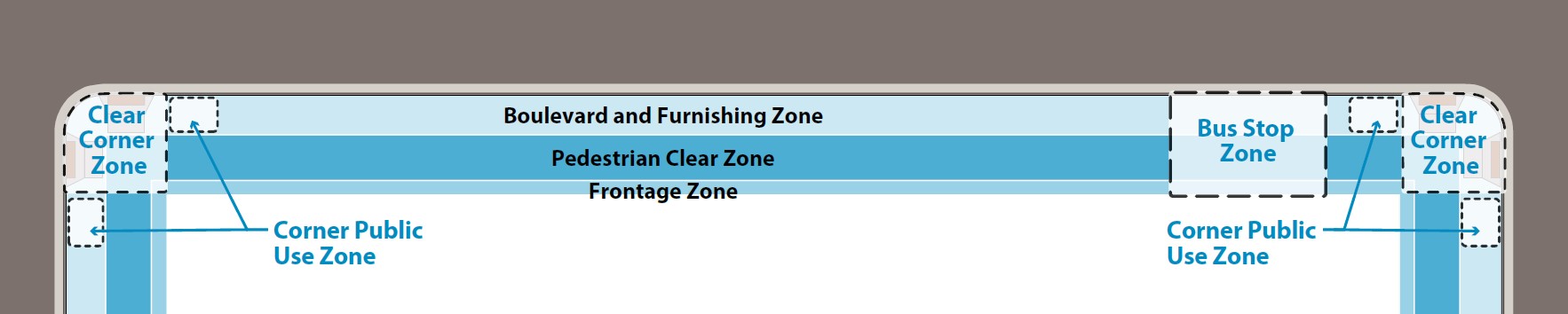 The sidewalk zone is divided into three main subzones: frontage zone, pedestrian clear zone, and boulevard and furnishing zone, which are described below. There are also three additional specialty subzones that overlap with the sidewalk zone: the clear corner zone, the corner public use zone, and the bus stop zone (see Figure 3.2A.1).