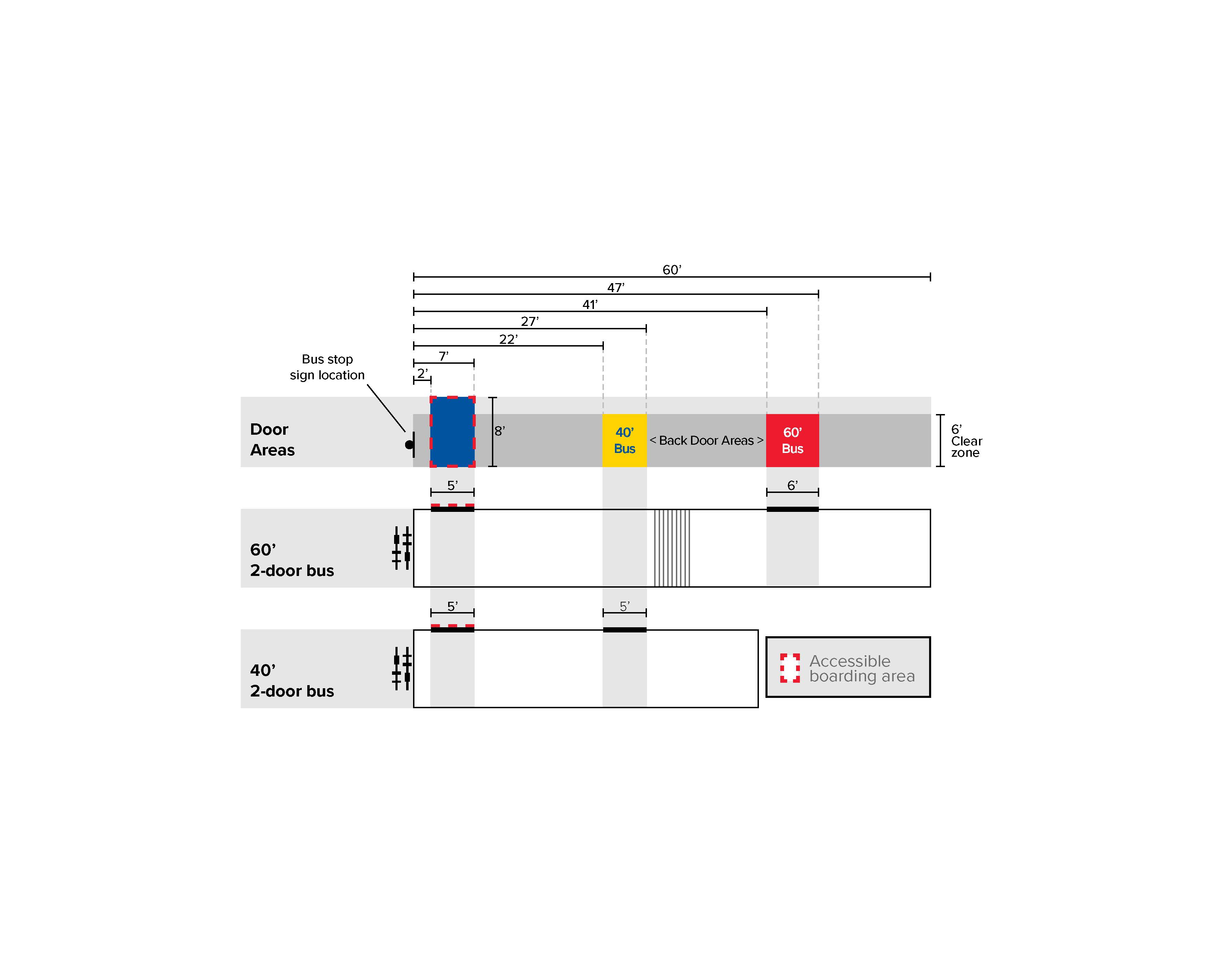 A back-door access zone is also preferred. Designers should collaborate with Metro Transit to determine if 40’-long buses or 60’-long articulated buses serve the corridor to locate boarding areas appropriately. Figure 3.5B.2 shows the door zones at local bus stops with common Metro Transit buses serving local routes. See also bus stop clear space.