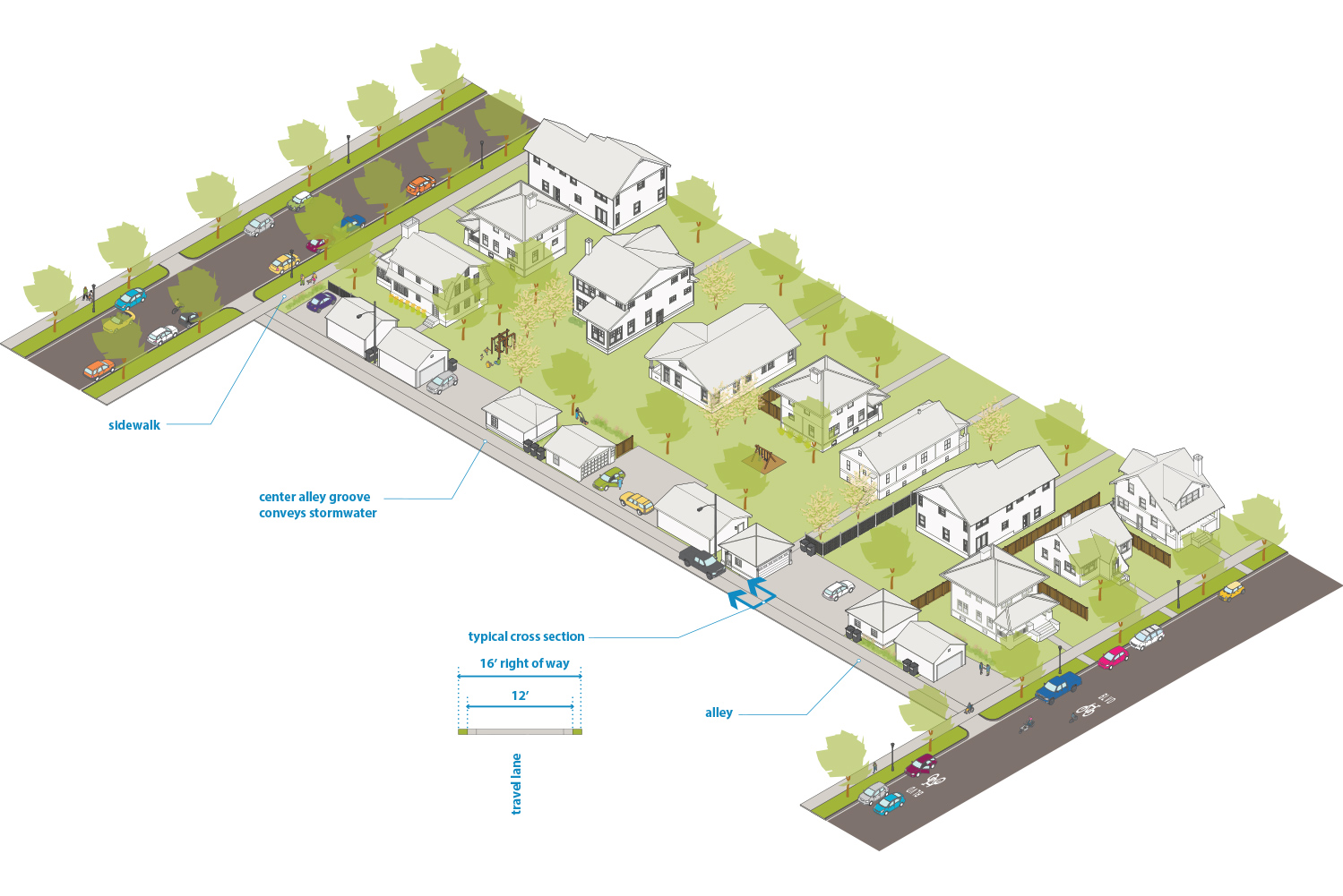 Landscaping is not typically included in alleys, but green stormwater infrastructure may be included as appropriate to treat and/or reduce stormwater runoff. |