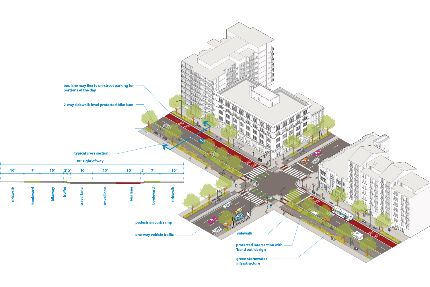 One-way Downtown Core street with bus-only lane and two-way protected bike lane (80’ effective right of way)