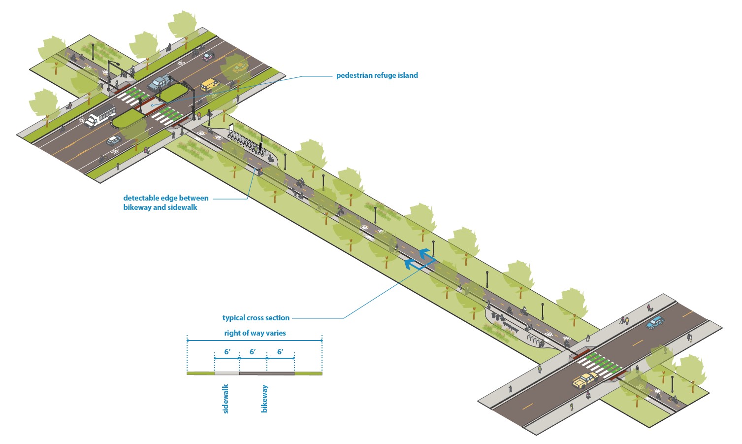 - Sidewalk and bikeway should be separated with vegetation or with a detectable edge. See sidewalk-level protected bike lanes guidance for more details on detectable edges.
