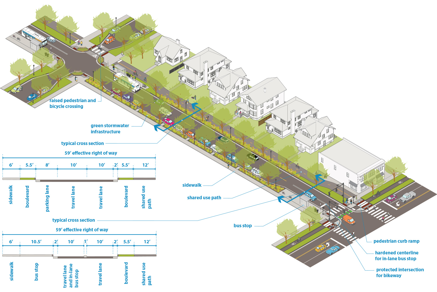 2-way Urban Neighborhood Connector street with 1-side parking and shared use path (59’ effective right of way)