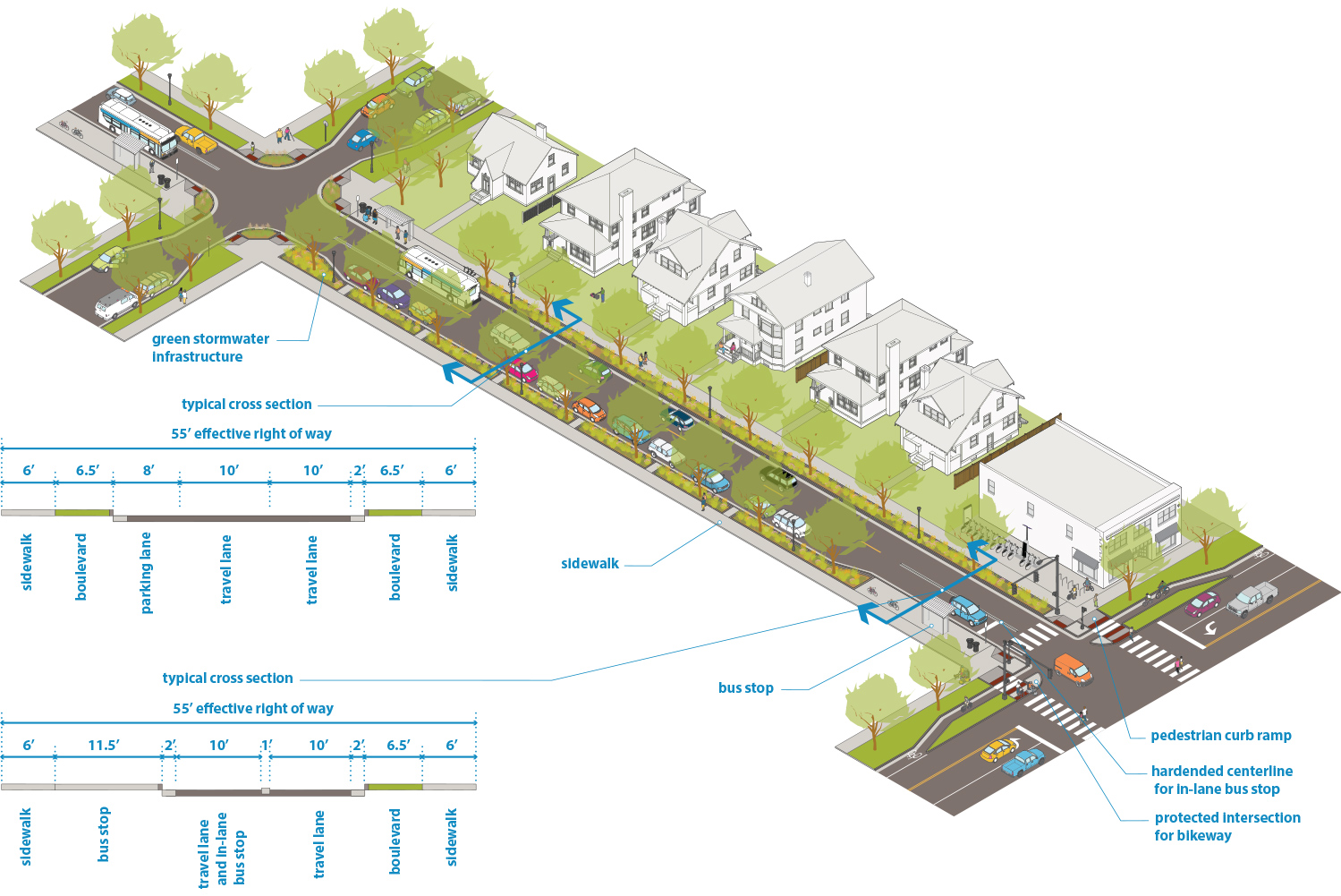 Urban Neighborhood Connectors are predominately residential, medium-volume streets (typically 1,500-5,000 average daily traffic) that often have local transit routes. They provide connections between Mixed Use streets and Urban Neighborhood streets, but are not typically intended for through motor vehicle trips of longer than one mile.